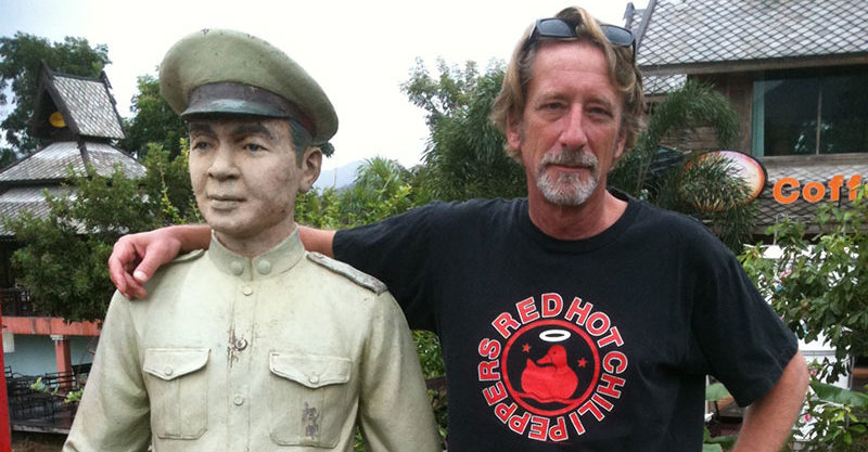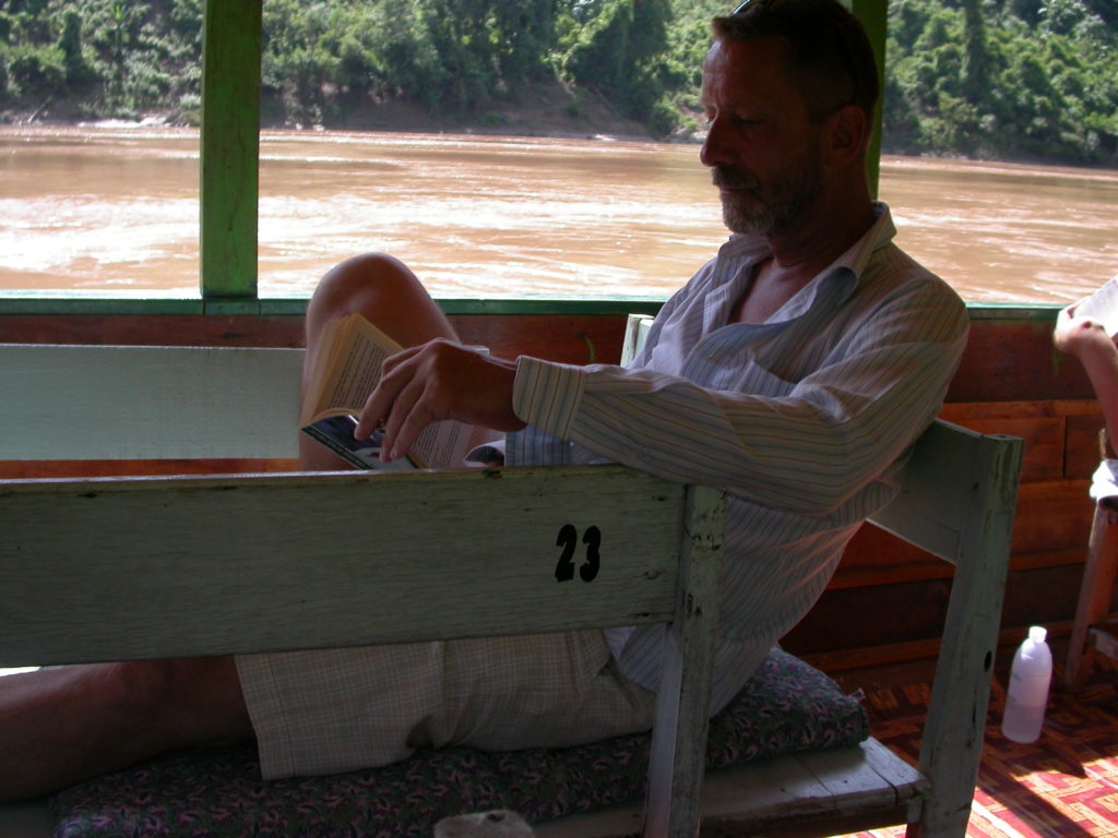 ラオス・ルアンプラバーンからメコン川を旅したときの夫。
