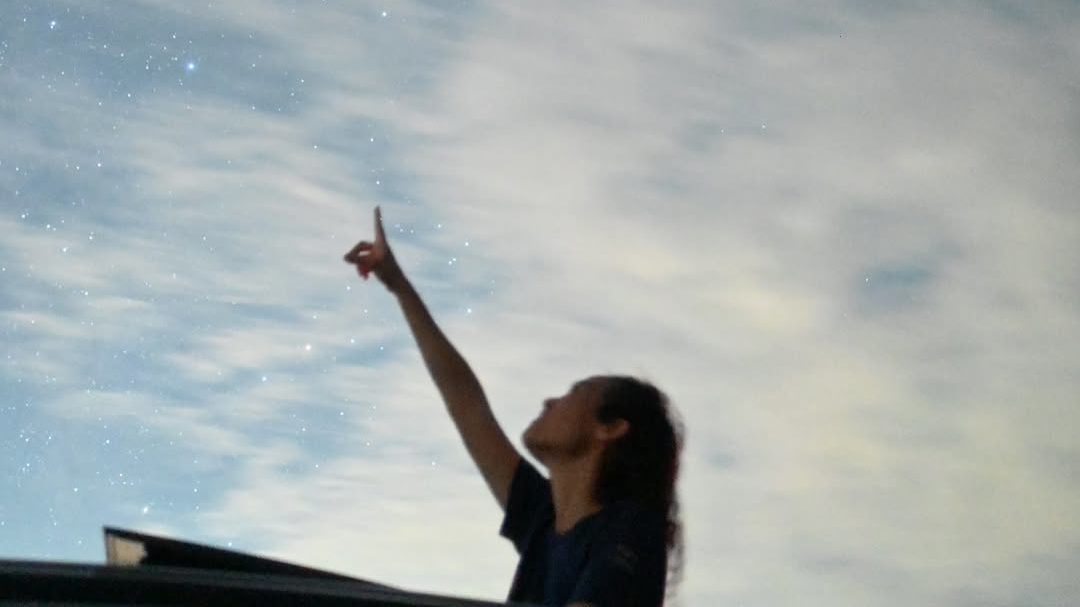 長男のお嫁ちゃんが車のルーフトップから顔を出して、指さしている先の星はおとめ座のスピカ。