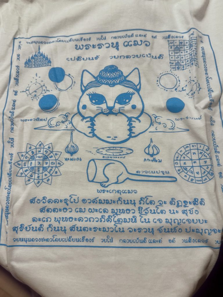 At Jing Jai Village Chiangmai, located just across the street from JJ Market. While I was killing time waiting for my car wash, my eyes were caught by a single T-shirt in a boutique. On a soft white background with serene blue lines, a cat was drawn. Above its somewhat charming figure, the Thai letters clearly read: “พระราหู” (Phra Rahu).
